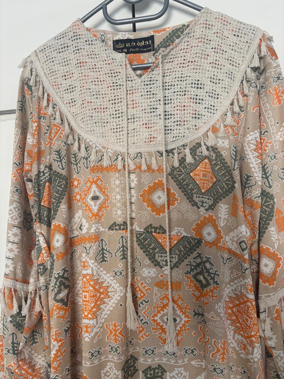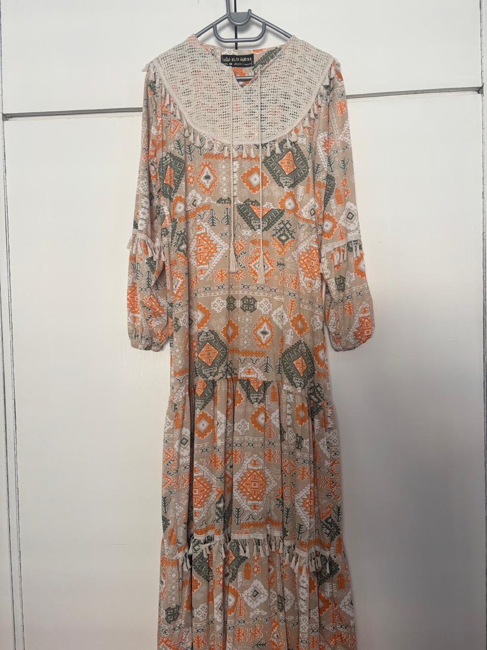 Boho Aztec print thrifted maxi dress imported from Egypt in beige, orange, and green with crocheted collar and fringe trim. Features long sleeves with elastic cuffs and a flowy tiered skirt. A sustainable, earthy style steal for your wardrobe.